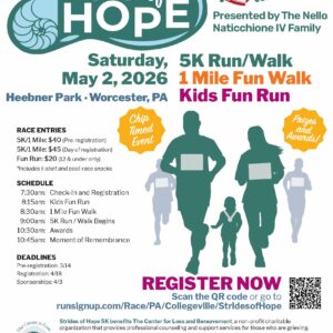 The Center for Loss and Bereavement (the Center) in Skippack, PA, a leading non-profit provider of grief support services, will host its 6th Annual Strides of Hope, a 5K Walk/Run, 1 Mile Fun Walk, and Kids Fun Run to raise support and awareness for the Center and the community we serve. The 2026 Strides of […]