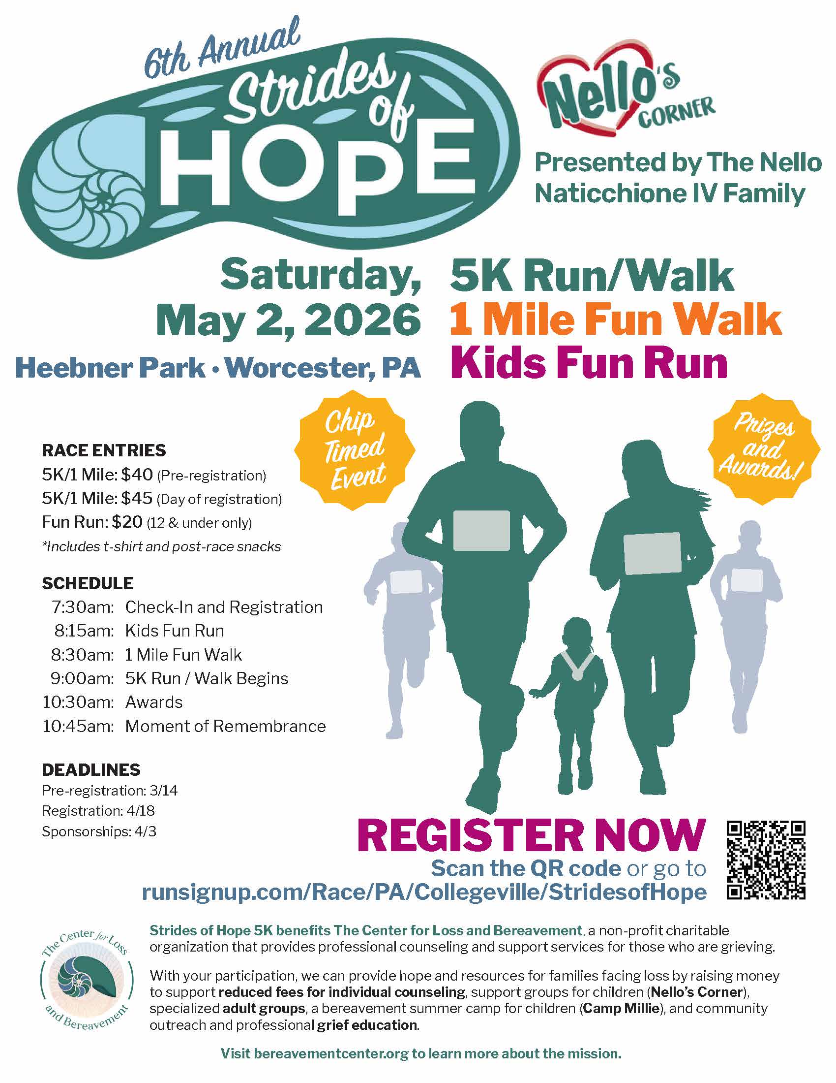 The Center for Loss and Bereavement (the Center) in Skippack, PA, a leading non-profit provider of grief support services, will host its 6th Annual Strides of Hope, a 5K Walk/Run, 1 Mile Fun Walk, and Kids Fun Run to raise support and awareness for the Center and the community we serve. The 2026 Strides of Hope will be held in Heebner Park in Worcester Township on Saturday, May 2, from 8am to 11am.